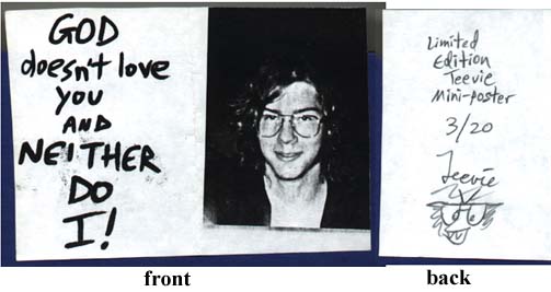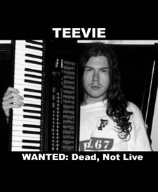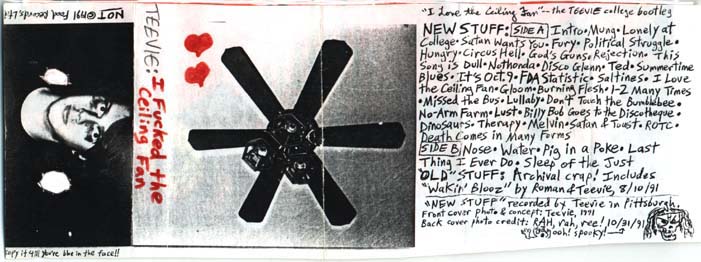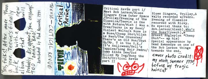 This is an attempt at a ridiculously comprehensive Teevie discography which includes various cassettes with hand-made or photocopy covers. If you are in possession of a Teevie "release" with an alternate cover than that shown here or not listed here at all, or if you've got additional interesting info I may have forgotten to mention (or forgotten entirely!) by all means contact me at doseoflogic@yahoo.com.